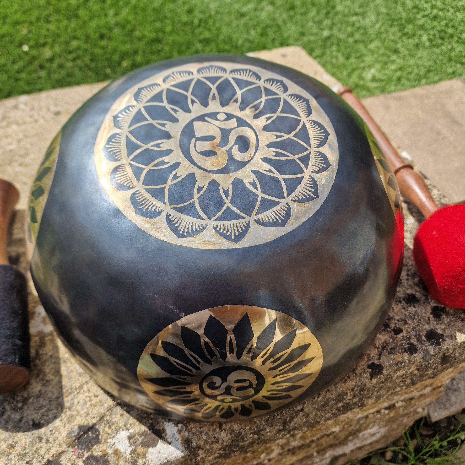 Handmade in Nepal using a traditional 7-metal alloy, this striking Tibetan singing bowl features a deep dark finish with the sacred Om (AUM) symbol set within a lotus mandala design.